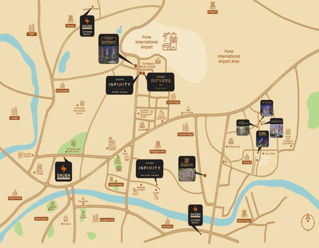 Viman Nagar is a landmark address for years to come, and the locale of Shubh Gateway is a class statement in itself. With the posh amenities it bestows on you, every aspect of your home will become the envy of many. Boost your status amongst your friends, colleagues, and kin, and gain a new level of respect. With proximity to the Airport, surrounded by influential IT hubs of Viman Nagar and Kharadi, and adorned with Premium Shopping Destinations and Posh Restaurants, you’re sure to receive a lifetime of joy. The affluence and world-class education available here is an added asset, and there’s so much more to explore than what meets the eye.
